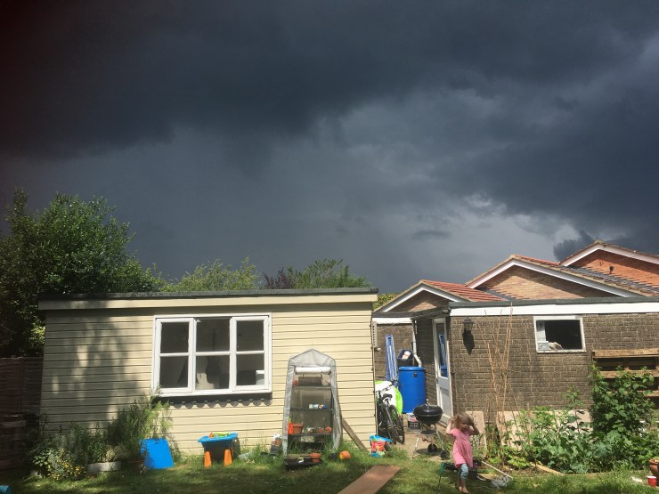 We were going to have a tea and cake picnic in the garden. It was beautifully sunny and then there was a huge rumble. Looking up, the sky was deep dark grey ‘mummy a storm is coming’. We tried to continue with our picnic but BP was having none of it, she gathered up the cake and went inside I did ask her to stay out but her persuasive arguments of ‘it gonna rain’ and after another clap of thunder ‘it bit noisy’ forced us all in. So we had our tea and cake picnic inside with the door open. The trees began to shake as the storm blew in, there were another 2 claps of thunder as we tucked in to the yummy carrot cake and then, nothing. There was no storm, it had completely blown over. By the time the tea and cake had gone the garden was full of sunshine again and we had enjoyed our inside picnic with a view.