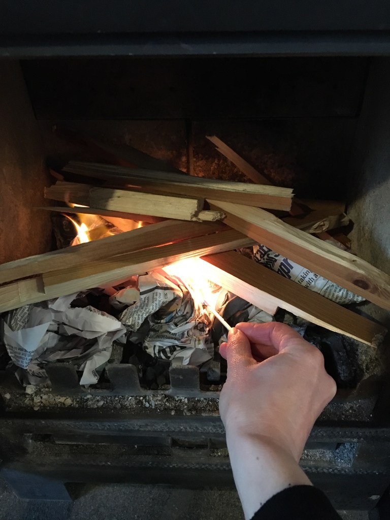 Making a fire is a ritual in itself, cleaning the burner of the old ash and then out to collect the wood. We have a log store, we made it 2 years ago and the log man comes twice in the winter. All of us move and stack the logs, a lovely group activity like a real life game of Jenga. Reaching in, collecting the logs and stacking them in my arms is a familiar task that millions of people around the world share. The sound of the wood banging together and feel of the cold, solid, soft wood are reassuring, the promise of the show to come. T and B both know how to setup the fire laying the paper then the kindling and do so very well. Then all the jobs come together as the match is struck and the fire comes to life. We will stay here a while, watching it, grateful for each other, this ritual and the shelter from the cold.